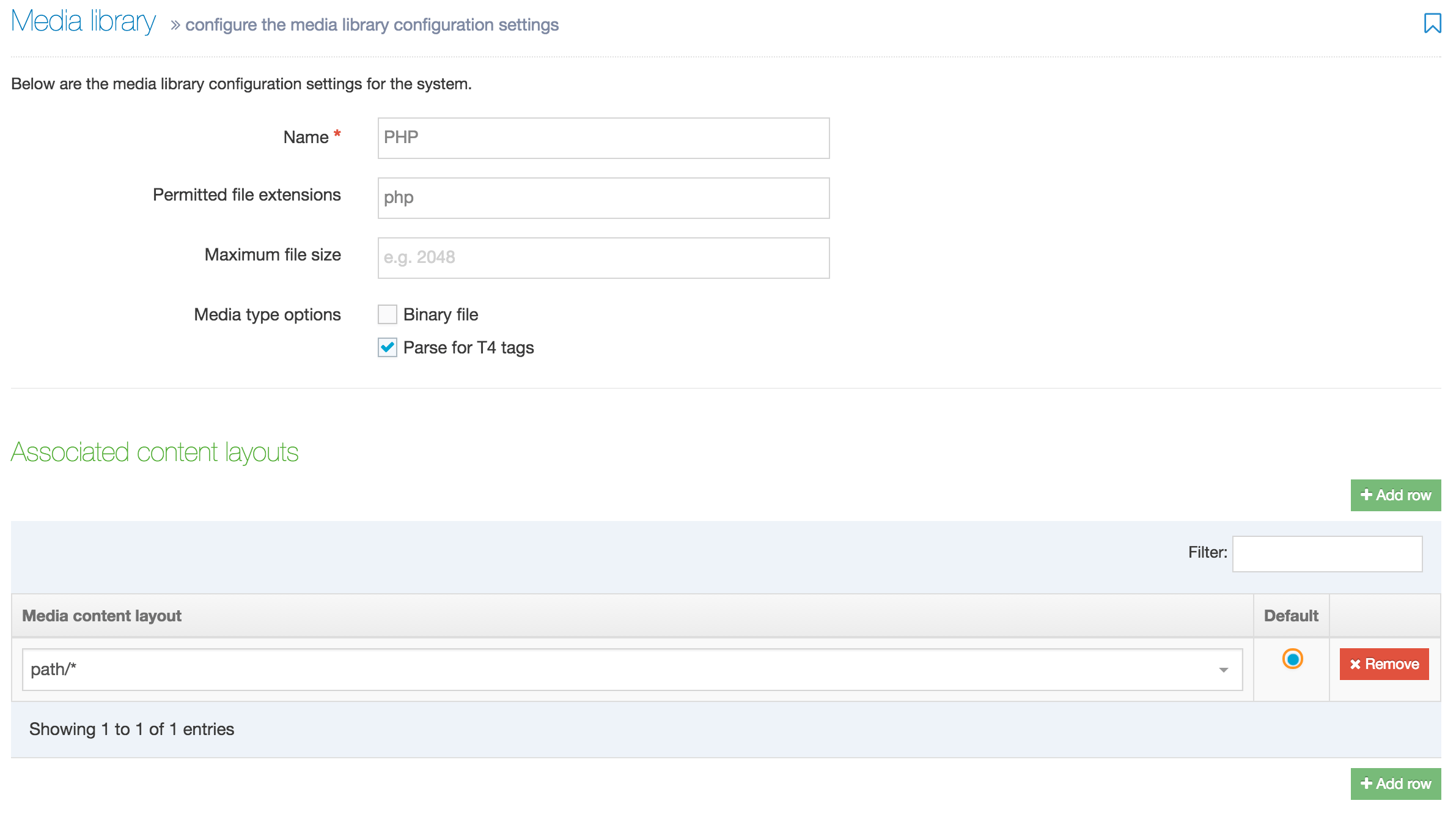 When the Content Layout has been created, go to System Administration > System Settings > Media Library and, in the Media Types tab, add the following Media Type: