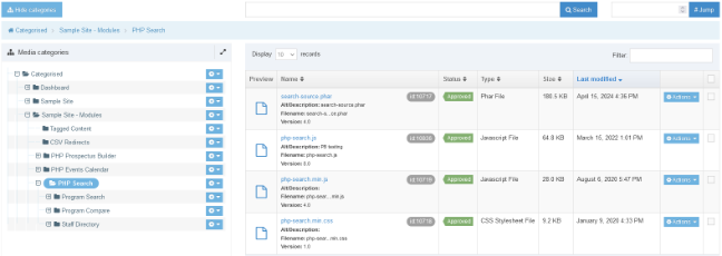 The "php-search.js" file can be uploaded to any Media Category. Select JavaScript as the Media Type.
