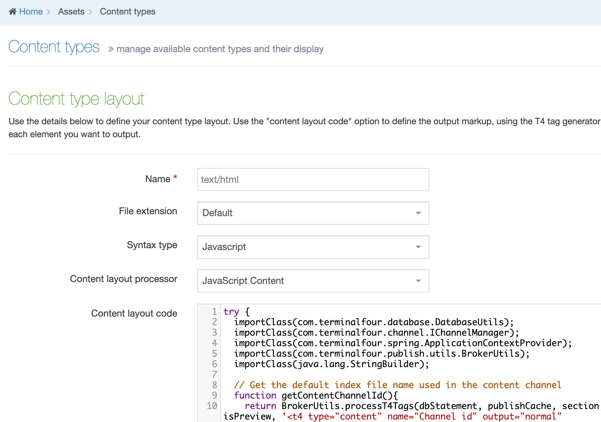 Create a Content Layout called text/html (or the default layout that you use on your channel) and set the Content Layout Processor to JavaScript Content.
