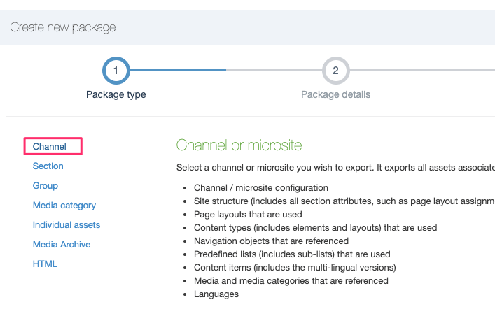 A Channel Package is a type of Package used to export a Channel, including the Channel configuration, Site Structure, Content, Media Items, and all assets that are used or referenced (Page Layouts, Content Types, Navigation Objects, Lists and Sublists) within the Channel.