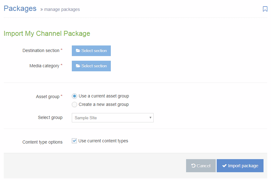 | Destination section | Select the Section that you would like to import the Package contents to. |