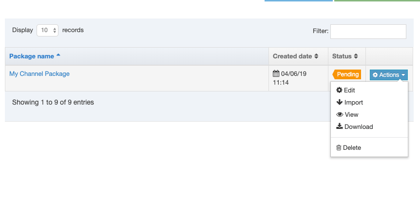 The Package has been created and is listed with a status of "Pending", and is now ready to Import or Download. If you want to archive or import the Package on another instance of Terminalfour, select Download. This will download a zip file containing the packaged Assets and content.