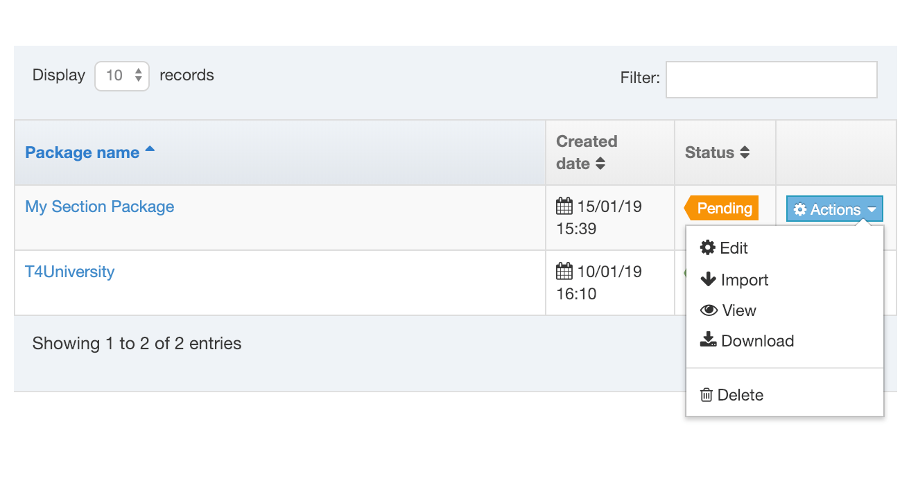 The Package has been created and is listed with a status of "Pending", and is now ready to Import or Download: