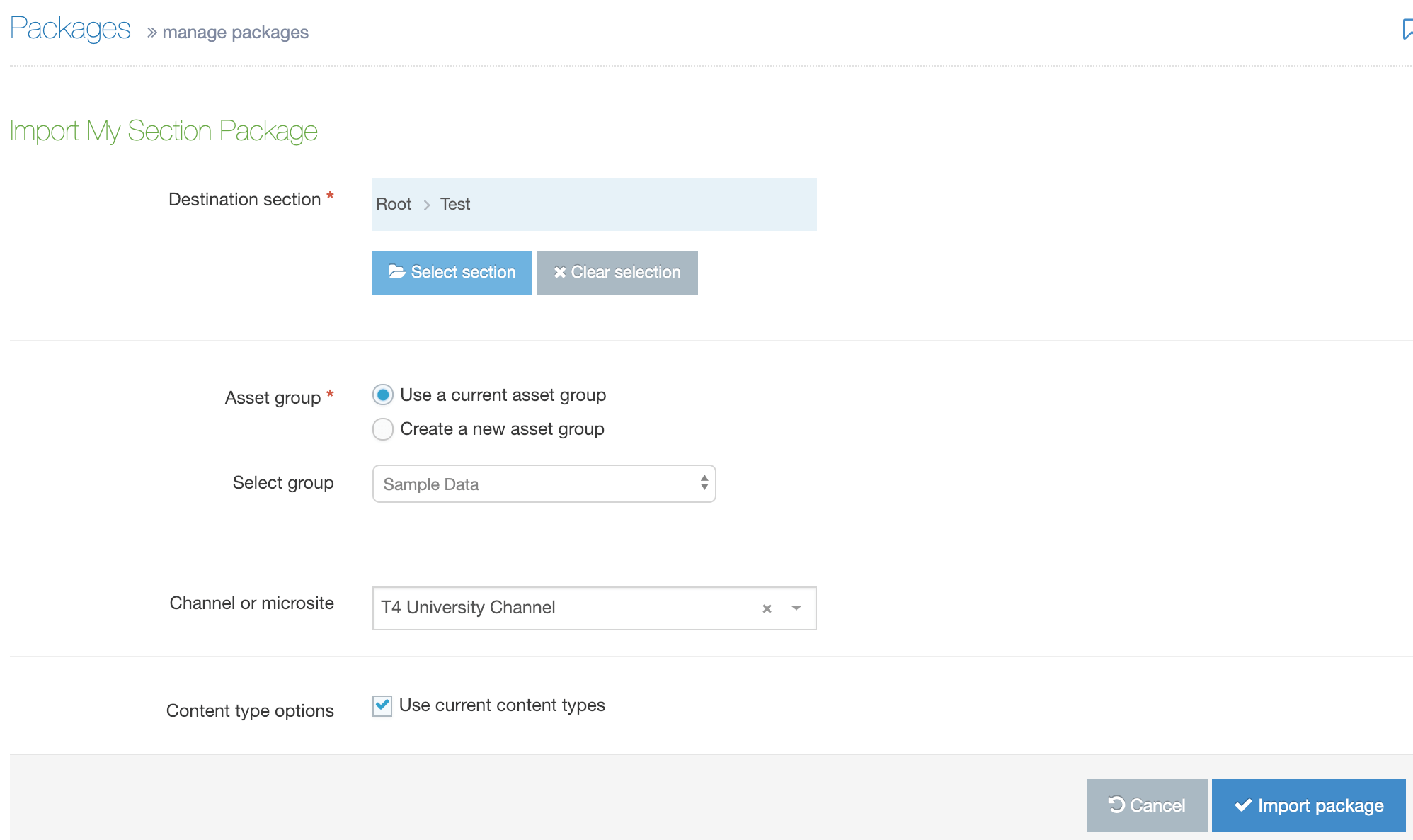 | Destination section | Select the Section that you would like to import the Package contents to. |