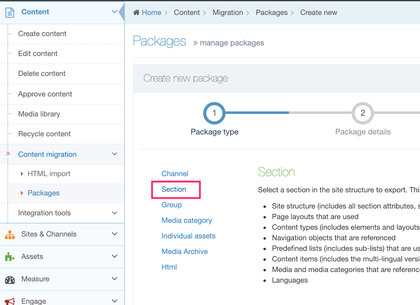 A Section Package is a type of Package used to export a Branch of the Site Structure, including Subsections, Content, Media Items, and all assets that are used or referenced (Page Layouts, Content Types, Navigation Objects, Lists and Sublists) within the Branch.