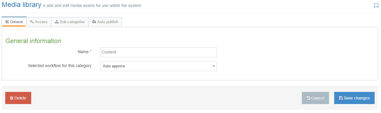 Categories can be used to manage access to create/edit media (write access) and use media (read access). Categories are also used as the folder names for images and documents when they are published (if this has been enabled under Generate Media in Preview & Publish Settings)