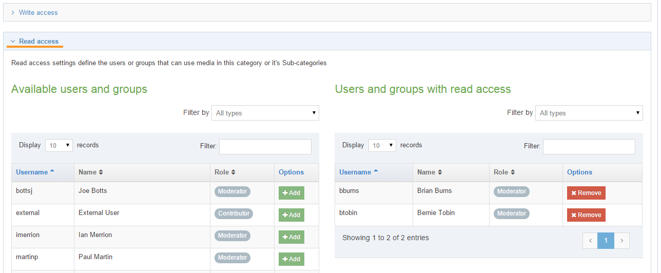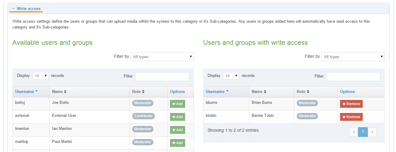 Write Access settings define the users or groups that can upload or edit media within the system to this Category or its Child Categories. Any users of groups added here automatically have "Read access" to this Category and any Child Categories.