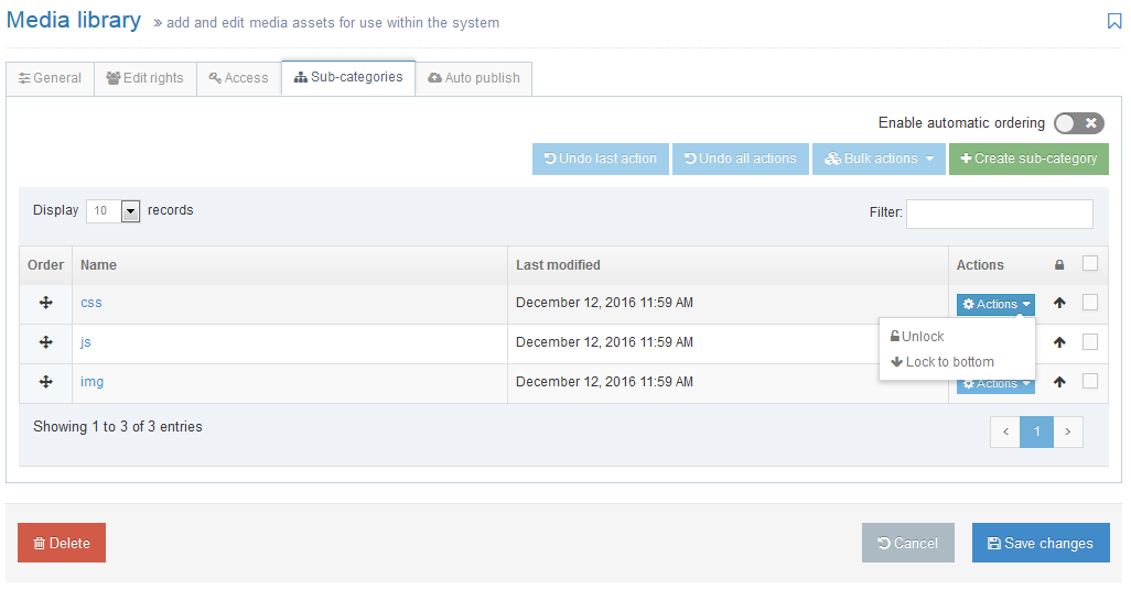 To automatically order the media Categories, select to Enable automatic ordering and select whether to order alphabetically or by last modified. It is then possible to lock specific sub-categories to the top or the bottom of the list.