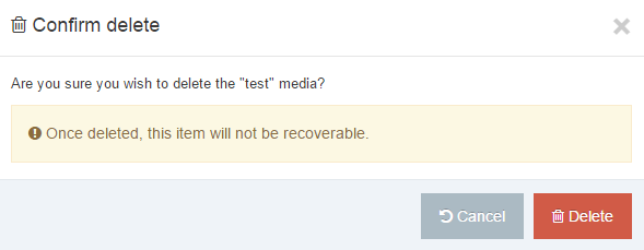 Once Media is deleted, it is sent to the Recycle Bin where it can be purged or recovered. If the Media Item is used in a Content Item, it will be removed from the Content Item.