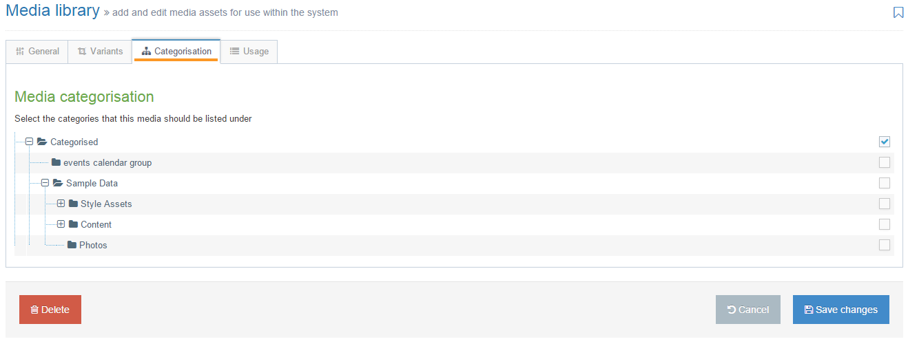 To create a variant, select the Variants option on the Action menu next to a Media item (this option will only appear if you have been granted Write access to the selected Media Category).