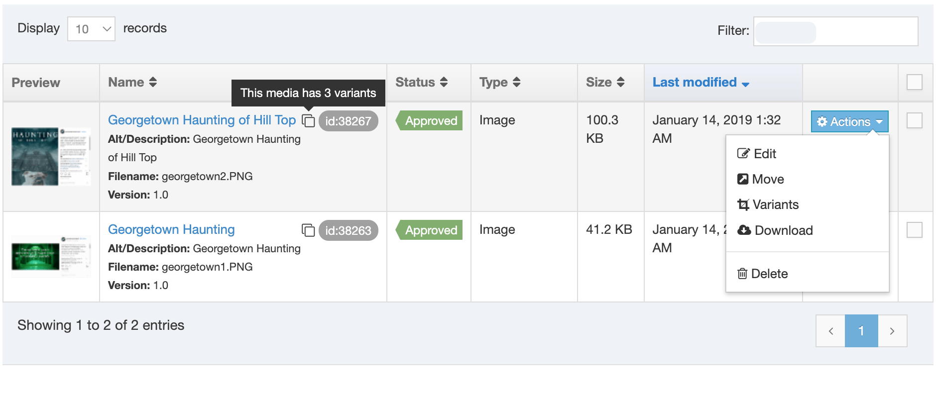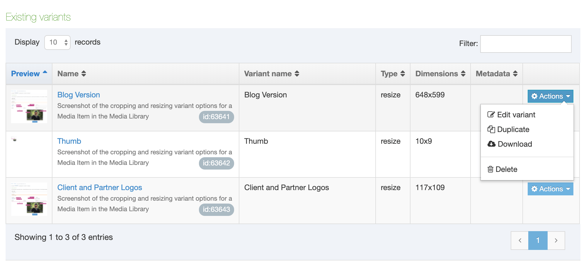 All Variants (resized or cropped) are added to the Existing Variants table. From the Actions menu, you can Edit, Duplicate, Download or Delete a Variant.