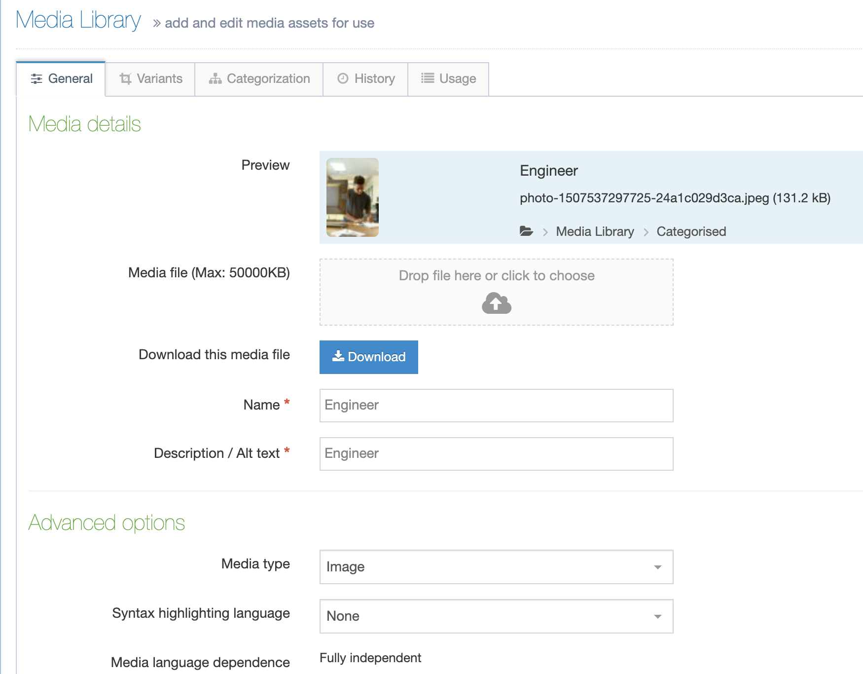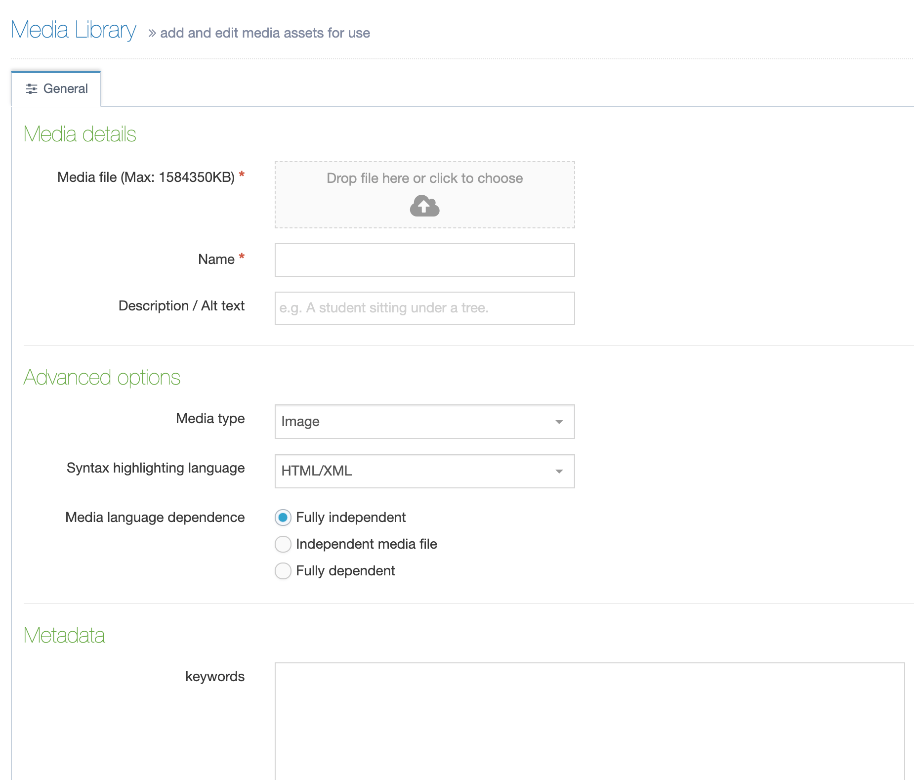 | Media file* | To upload a file click the dropzone and select a file from your local machine or drag a file to the dropzone. | ||||||||||||||||||||||||