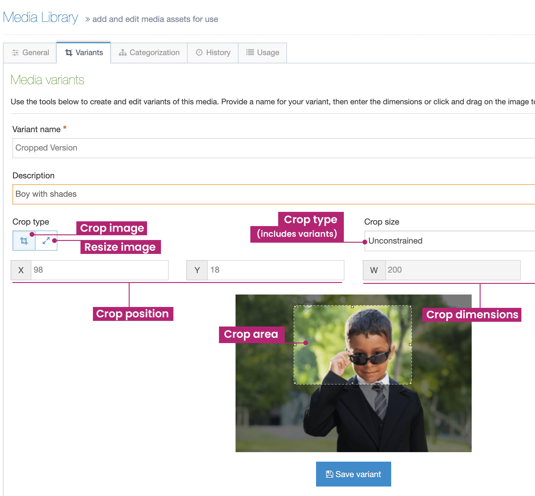 With Media Variants, you can create resized and cropped versions of Media Items, while retaining the original. Depending on the Media Variant configuration, these may be created automatically when Media is added, or they can be created manually.