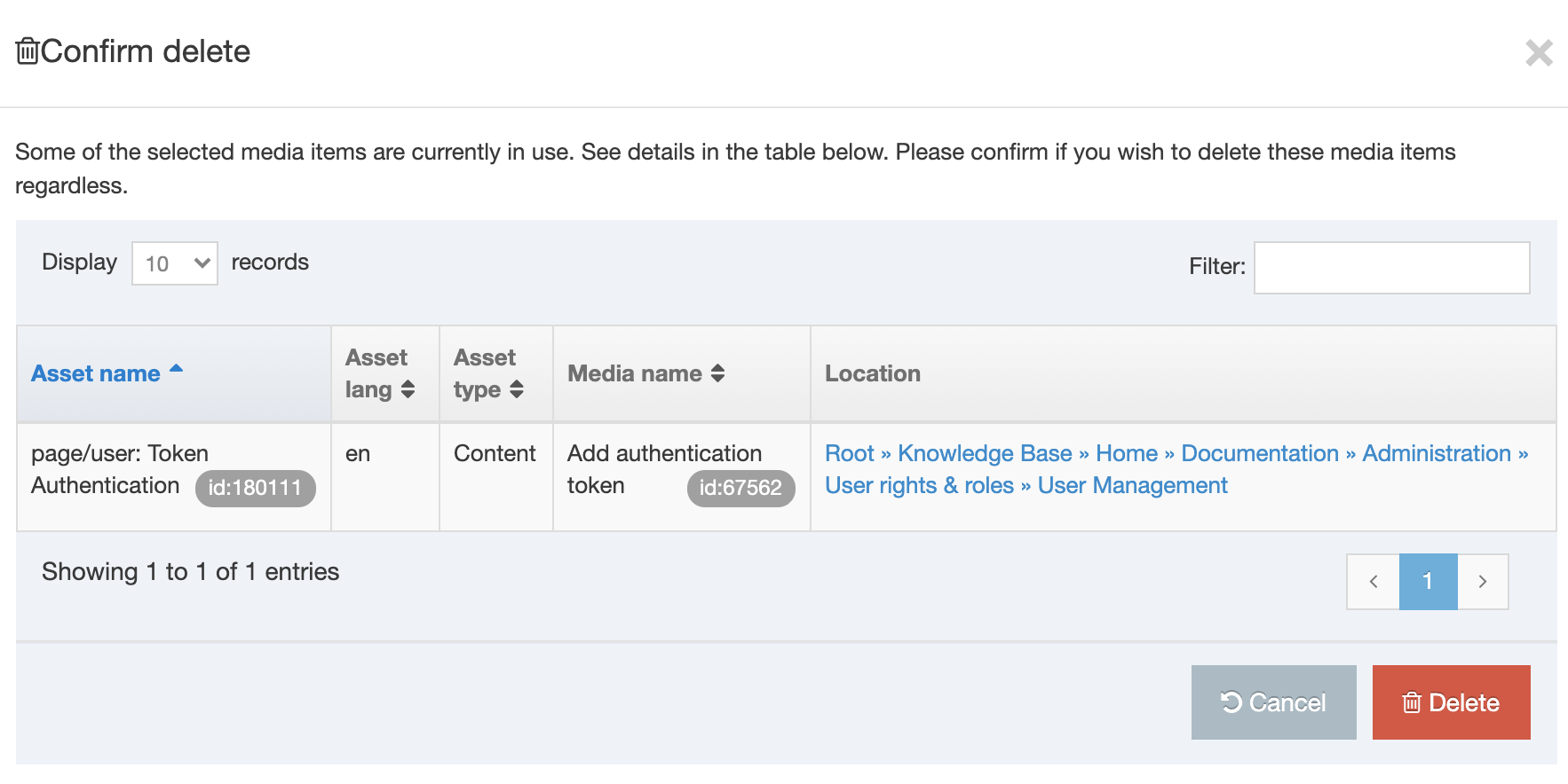 From version 8.3.10 the Confirm Delete modal will list the Content Items where the Media Item is present:
