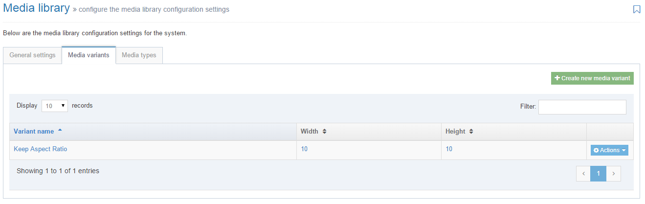 When an image is uploaded to the Media Library you may want one or more resized versions to be automatically created, e.g., when a large photo is uploaded, a small thumbnail is generated as well. The presets used for these variants are configured here.