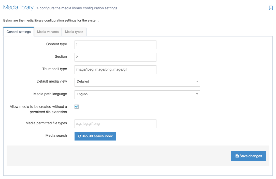 | Media permitted file types | Enter a comma-separated list of file extensions to restrict the file types that can be uploaded into the Media Library. This also applies to image elements in Content Types. File elements can be configured in the content configuration. If blank, no restrictions are applied. e.g. jpg,gif,png |