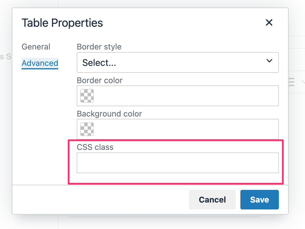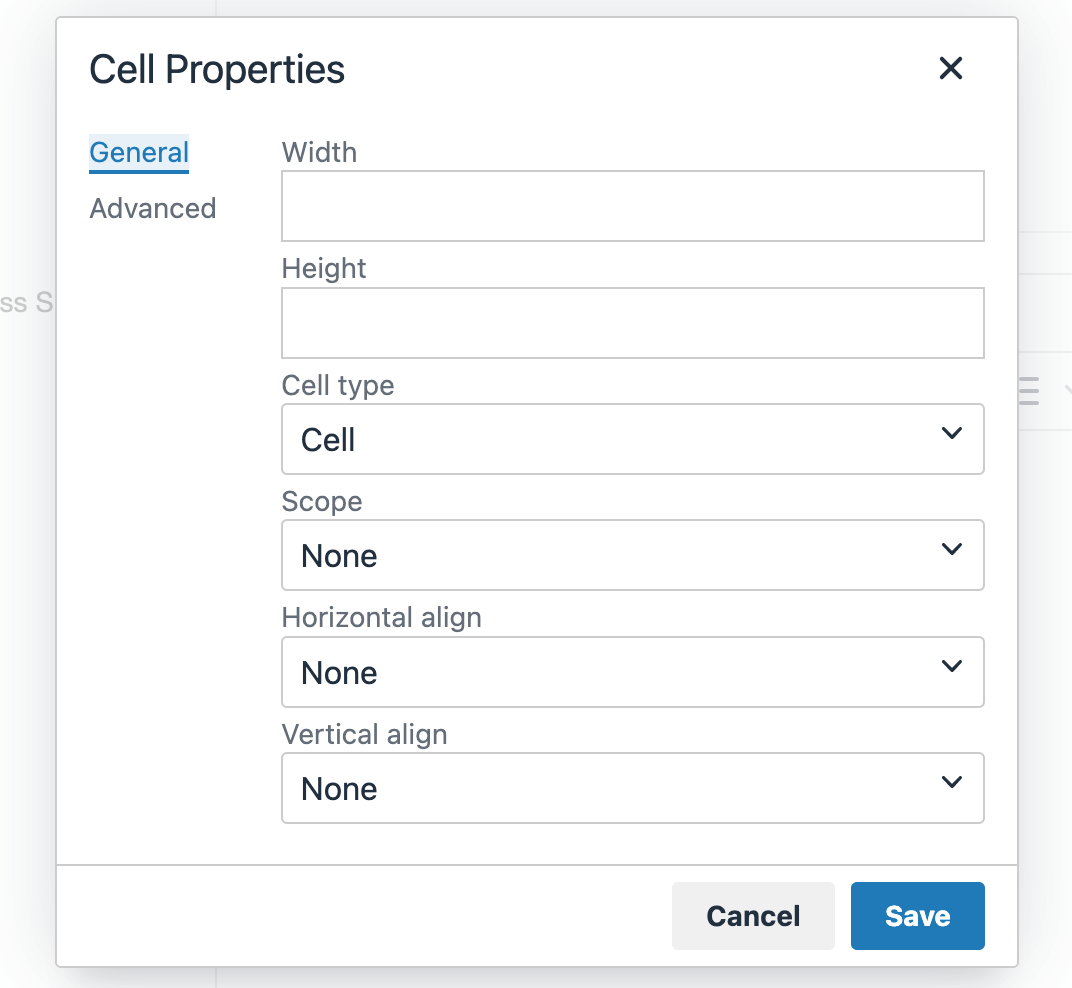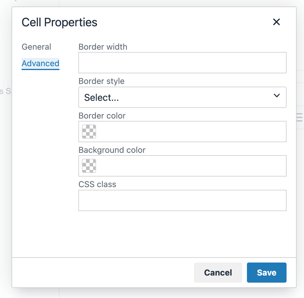 Change table layout and appearance properties like width, height, padding and border. Under the advanced settings, you can add CSS styles. See the documentation on Table Properties below. |