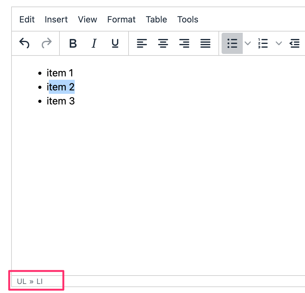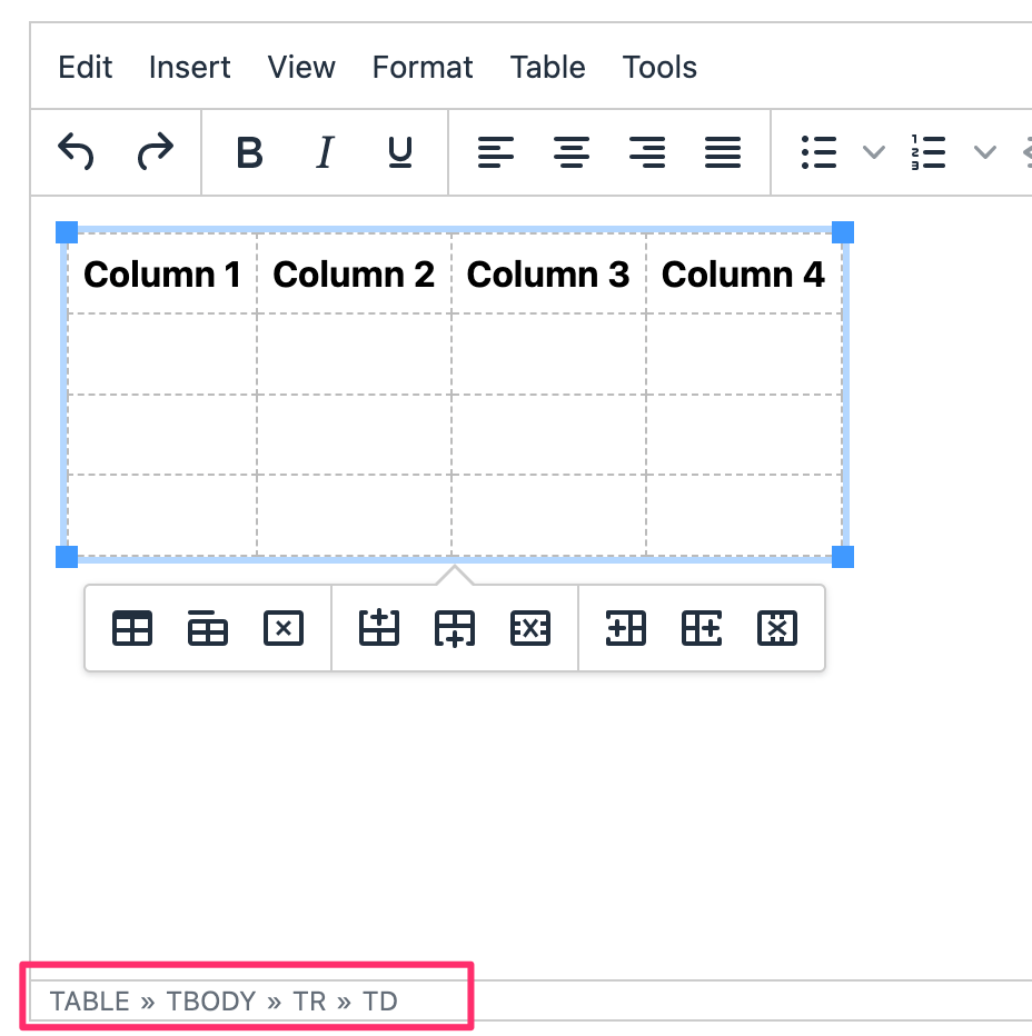 Located in the footer status bar of the editor is a descriptor corresponding to the location of the cursor/pointer. This is similar to breadcrumbs as there can be several elements to the descriptor. Each element is linked to a point on the page. Click the last element (td) and that area is highlighted.