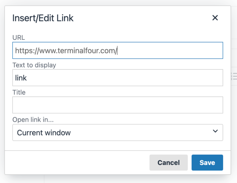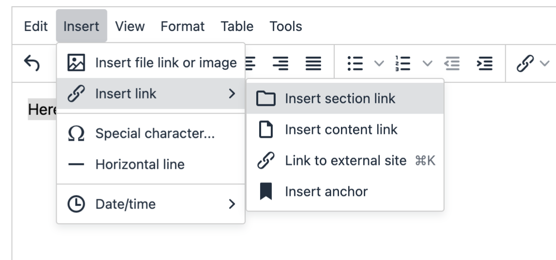 To link to a Terminalfour Section or Content Item select text or an image and go to Insert > Insert link > Insert section link or Insert content link (or select the link icon from the menu).