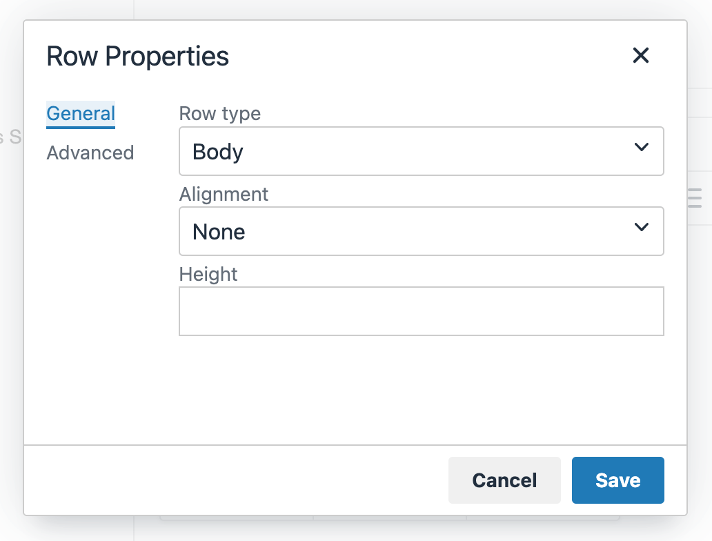 1. Row type - choose from Header, Body, or Footer (in Advanced you can also set colors.)