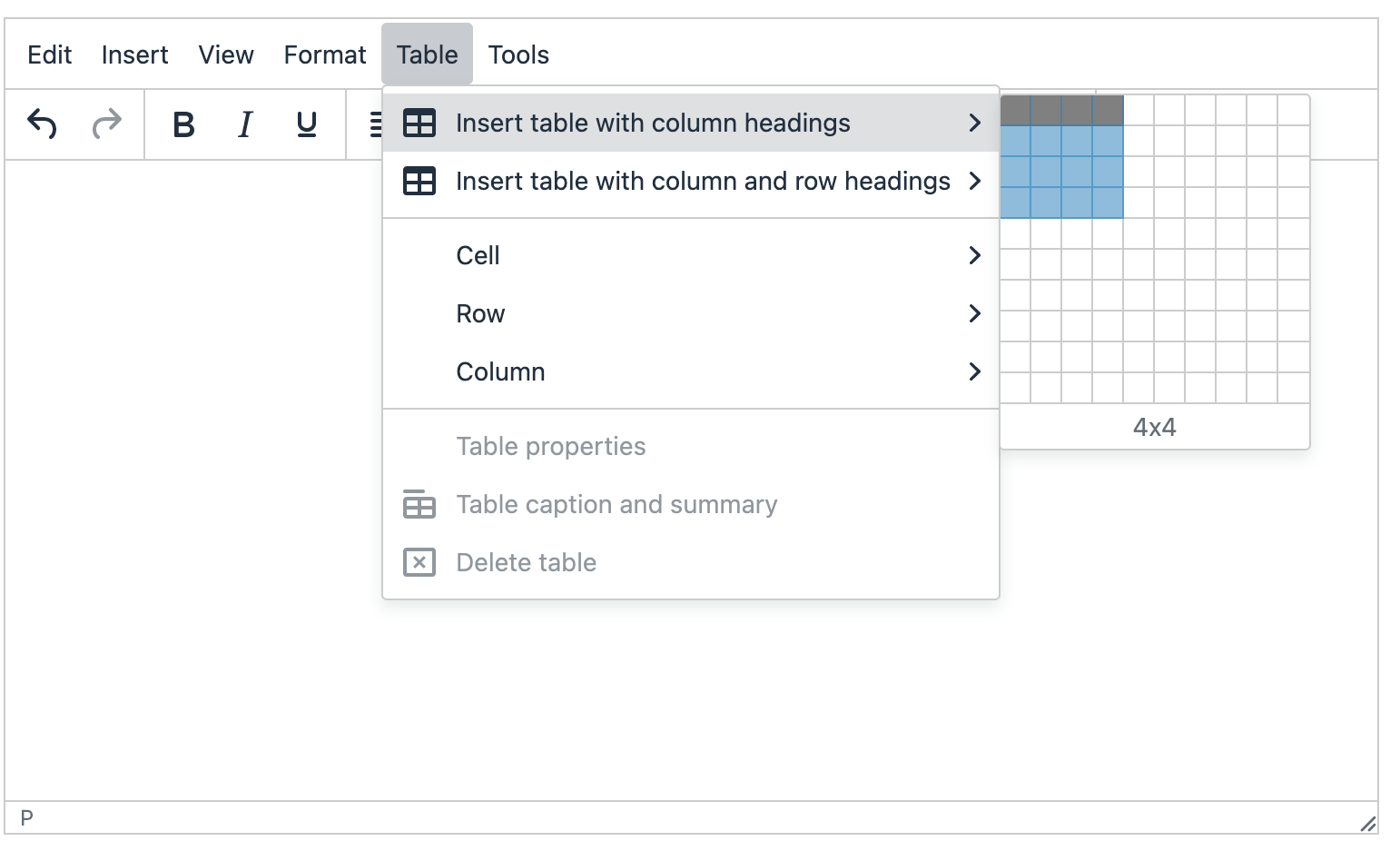 To insert a table, click Table on the toolbar menu. This screen opens: