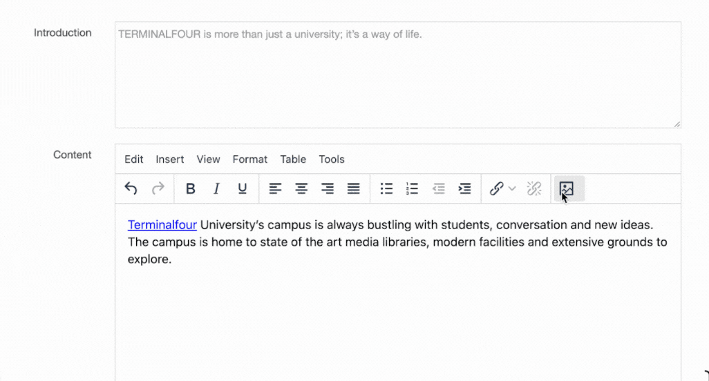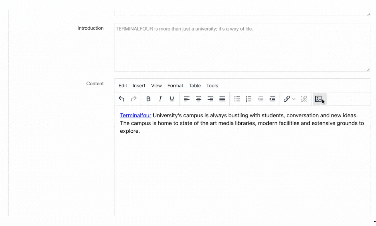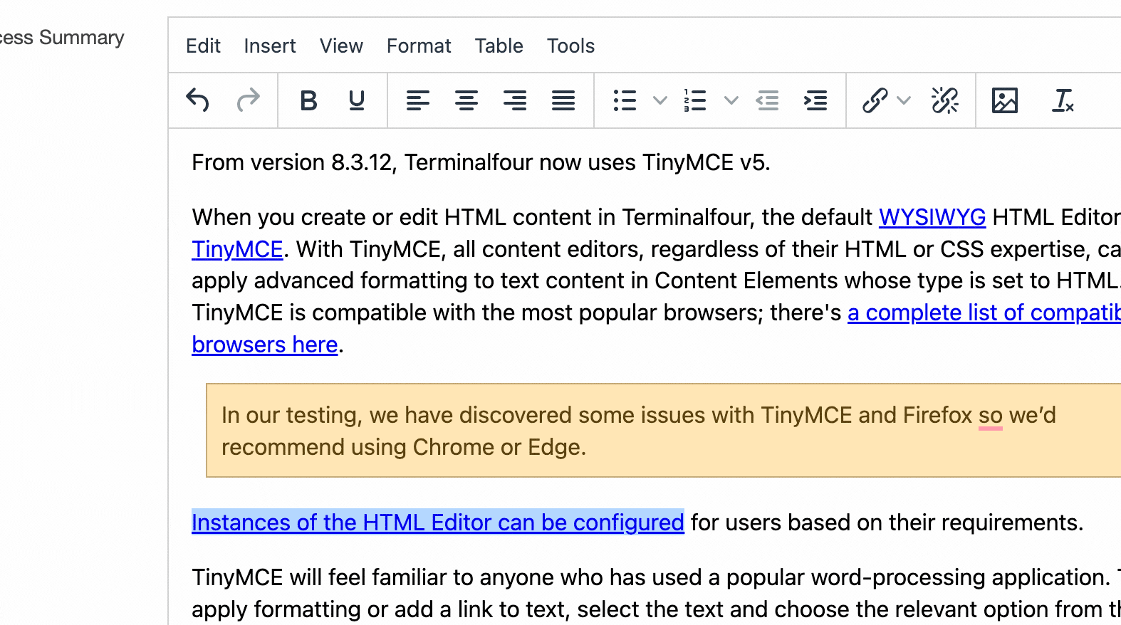When you create or edit HTML content in Terminalfour, the default WYSIWYG HTML Editor is TinyMCE. With TinyMCE, all content editors, regardless of their HTML or CSS expertise, can apply advanced formatting to text content in Content Elements whose type is set to HTML. TinyMCE is compatible with the most popular browsers; there's a complete list of compatible browsers here.