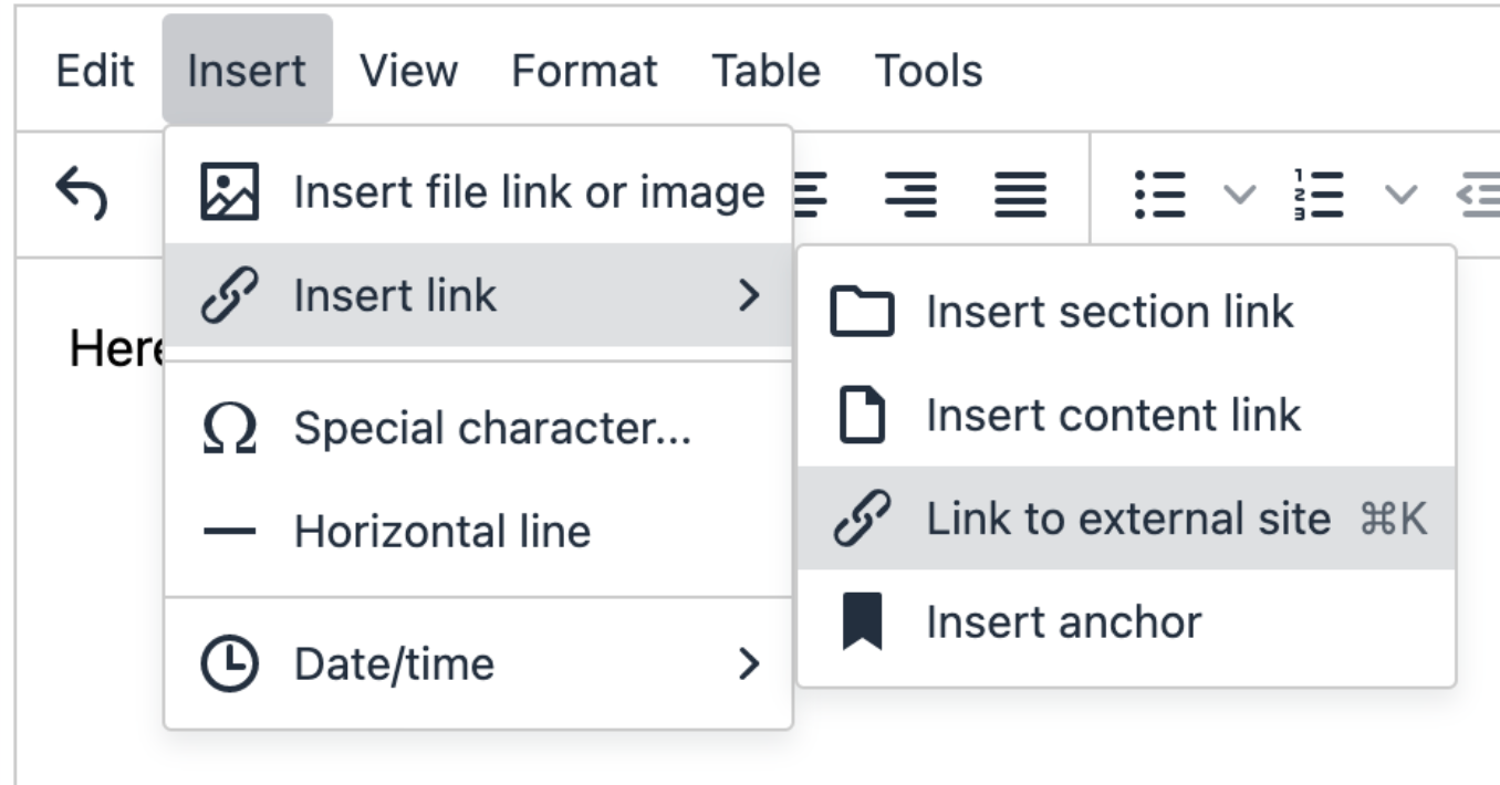 To link to an external website select text or an image and go to Insert > Insert link > Link to external site (or select the link icon from the menu). Alternatively, you can use the Ctrl+K key combination.