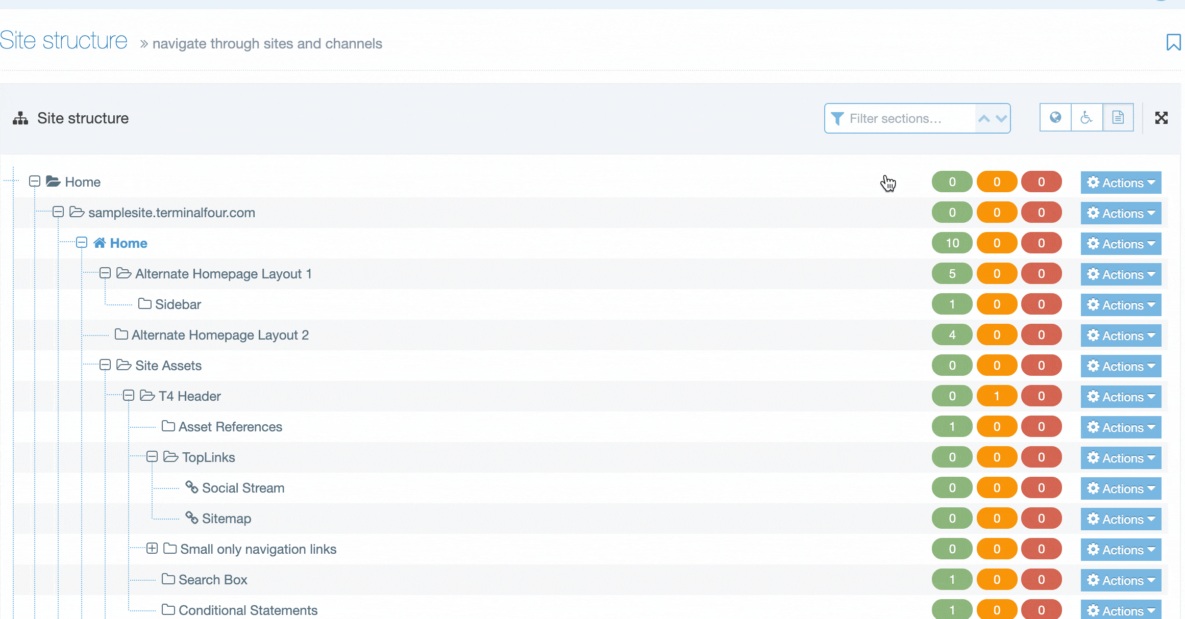 Each Section displays useful information to help you improve the SEO and web accessibility of your pages, as well as information on the Publish status of content in each Section.