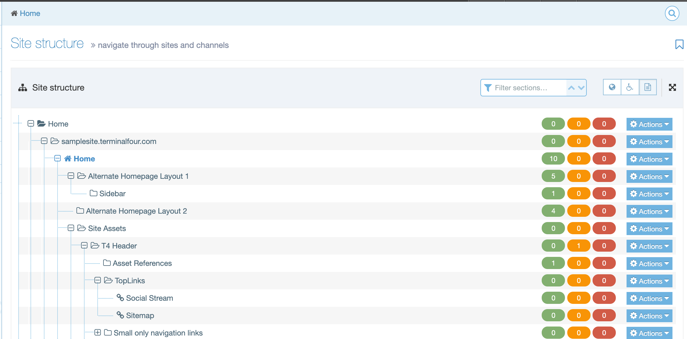 Your System Administrator may have configured the Site Structure as the default page in your instance of TERMINALFOUR. In this case, the Site Structure page displays when you log in or when you select the "TERMINALFOUR" label from the top left of the header.
