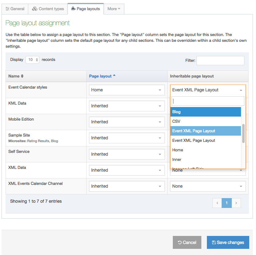 1. Select the Page Layout you want to use from the drop-down menu for the relevant Channel. The selected layout is used for the Section it is assigned to as well as any Subsections (children) for which no Page Layout has been specified.
