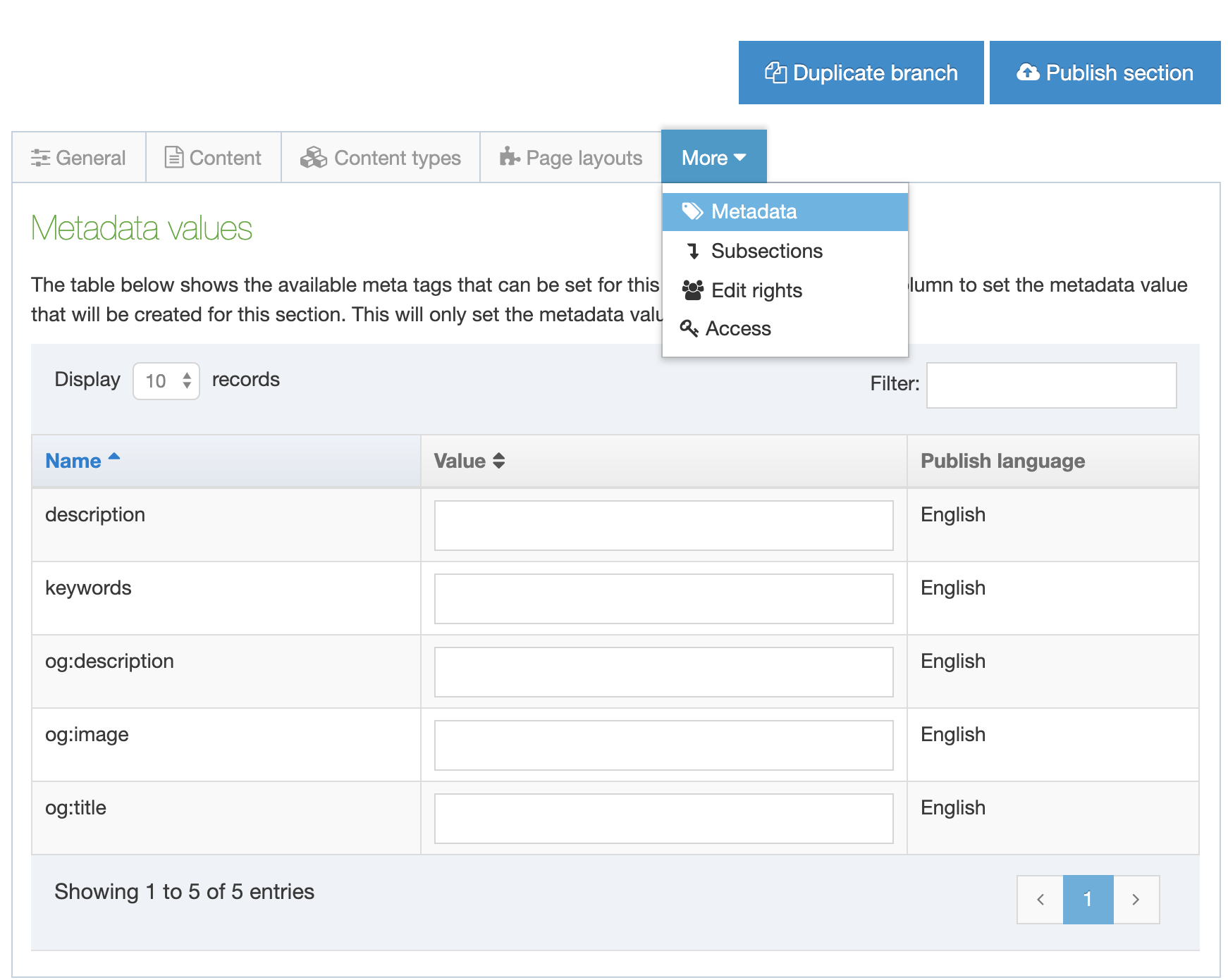 From the More tab, select Metadata. Metadata can be added at various levels, such as, for a specific Content Item, for a section or to a Page Layout. The metadata options available depend on how you configure Meta Tags.