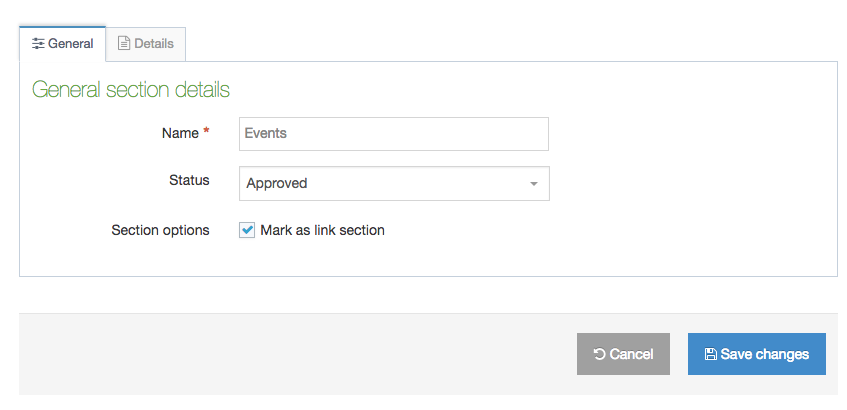 To create a Link Section, create a Section and, in the General Settings screen, select Mark as Link Section from the Section Options. When this option is selected, the other Section Options are hidden.