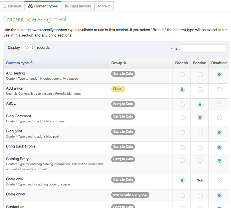 - The list is ordered alphabetically and grouped by the owning group. If you enable a Content Type for a Branch, it can be used in the current Section, the Section's Subsections or children (for the Branch).
