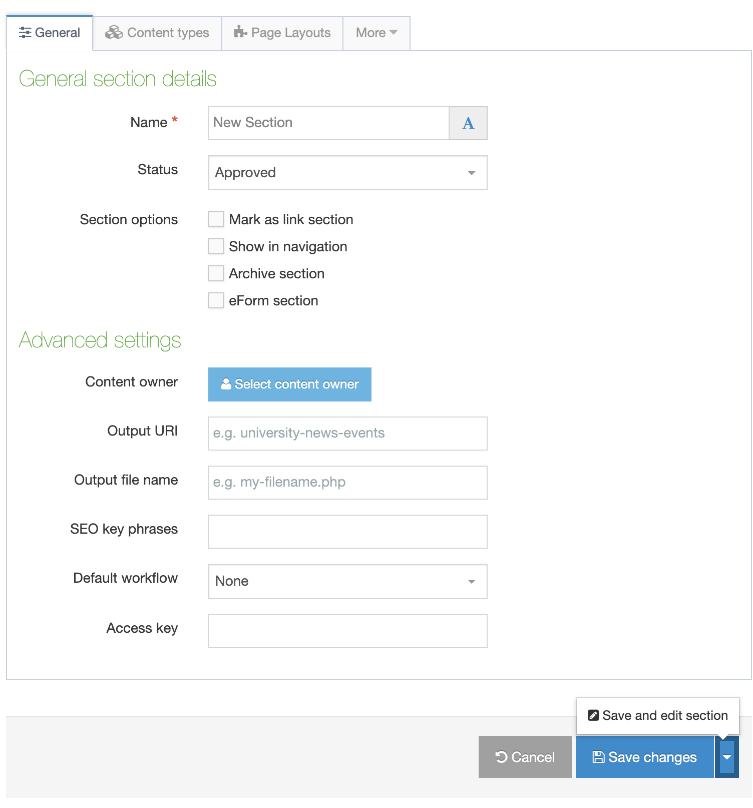 It should be noted that depending on your Section metadata content type, more fields may be available at the top of the Advanced settings. These fields are installation specific and hence not covered here.