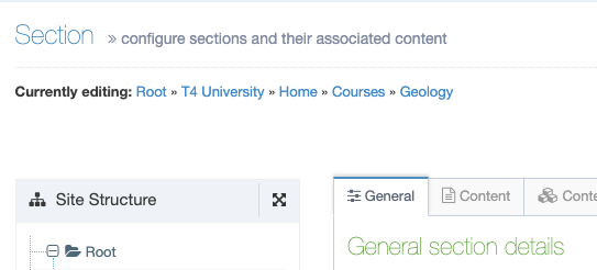 The General tab of the Section configuration screen is split into General Section details and Advanced settings.