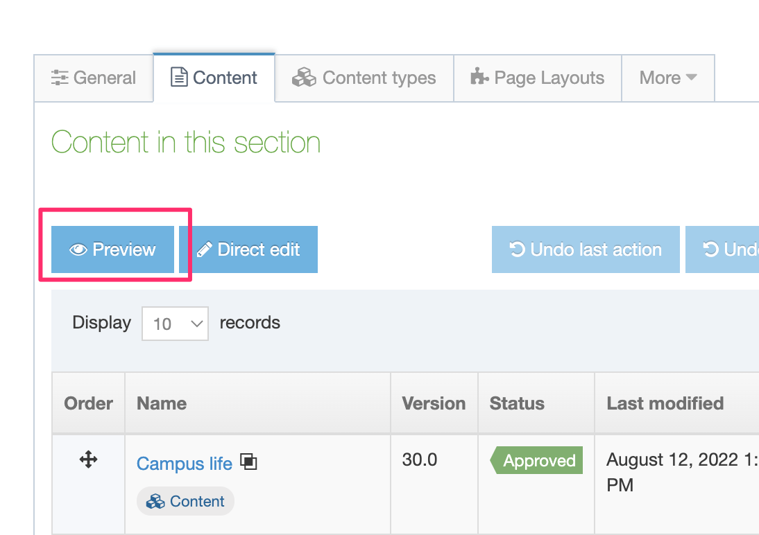 As part of your Quality Assurance process, you might want to ensure that, even before content has been approved, a page publishes as intended. Although you can preview a Content Item from the Edit Content page, you can also preview directly from the Site Structure, which saves you from drilling down into the content.