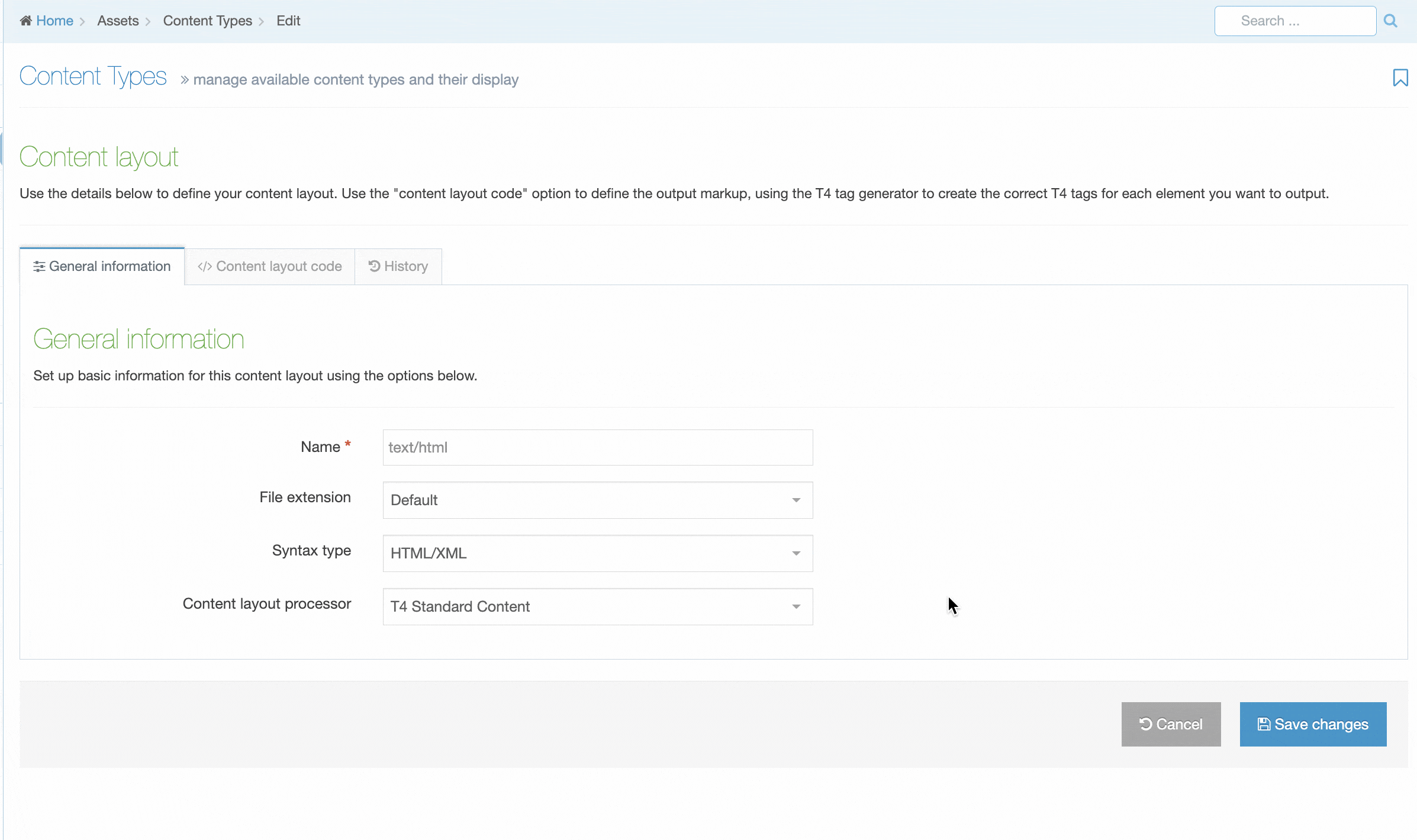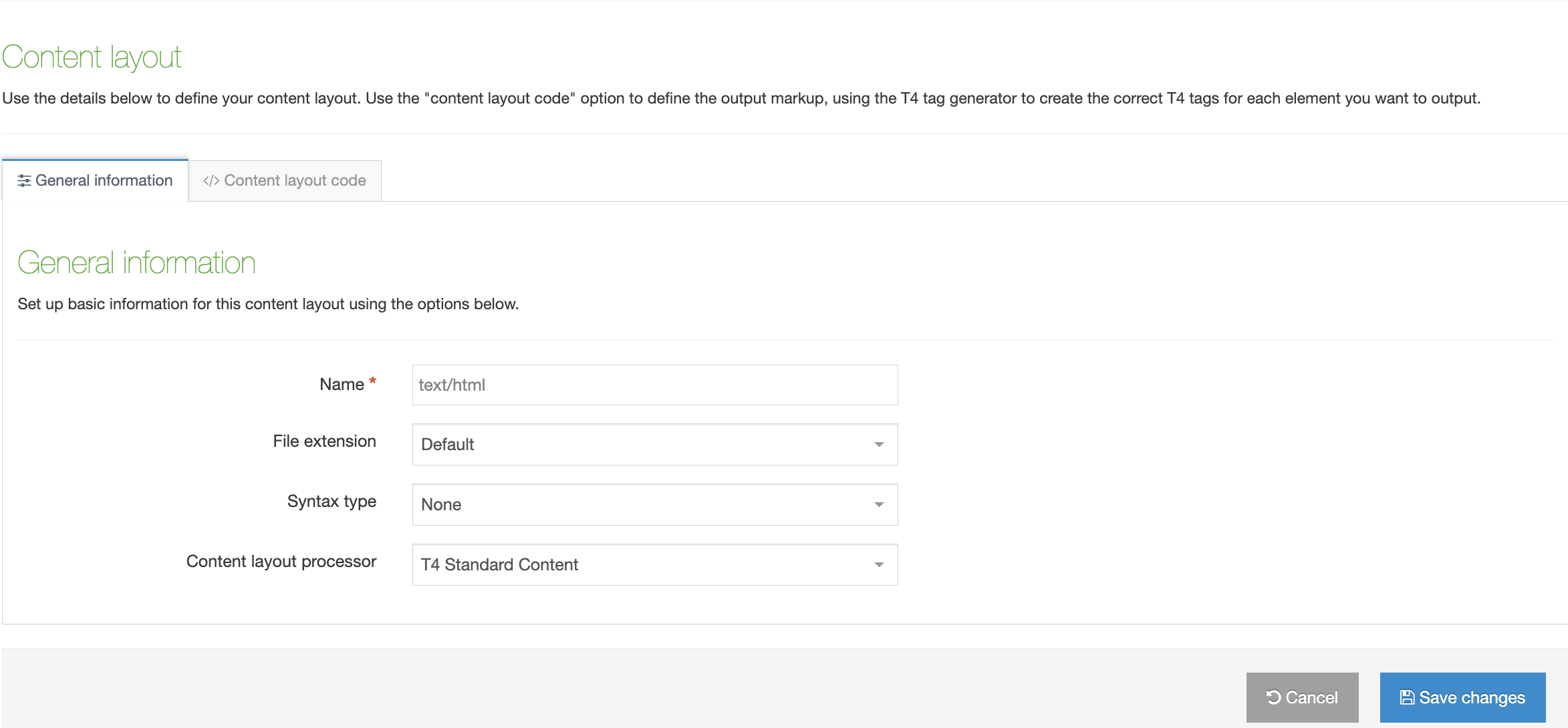 This determines what is output and how it is displayed. Depending on the Content Layout Processor selected, T4 Tags or Handlebars Expressions are used to output the content entered in your Content type elements. |