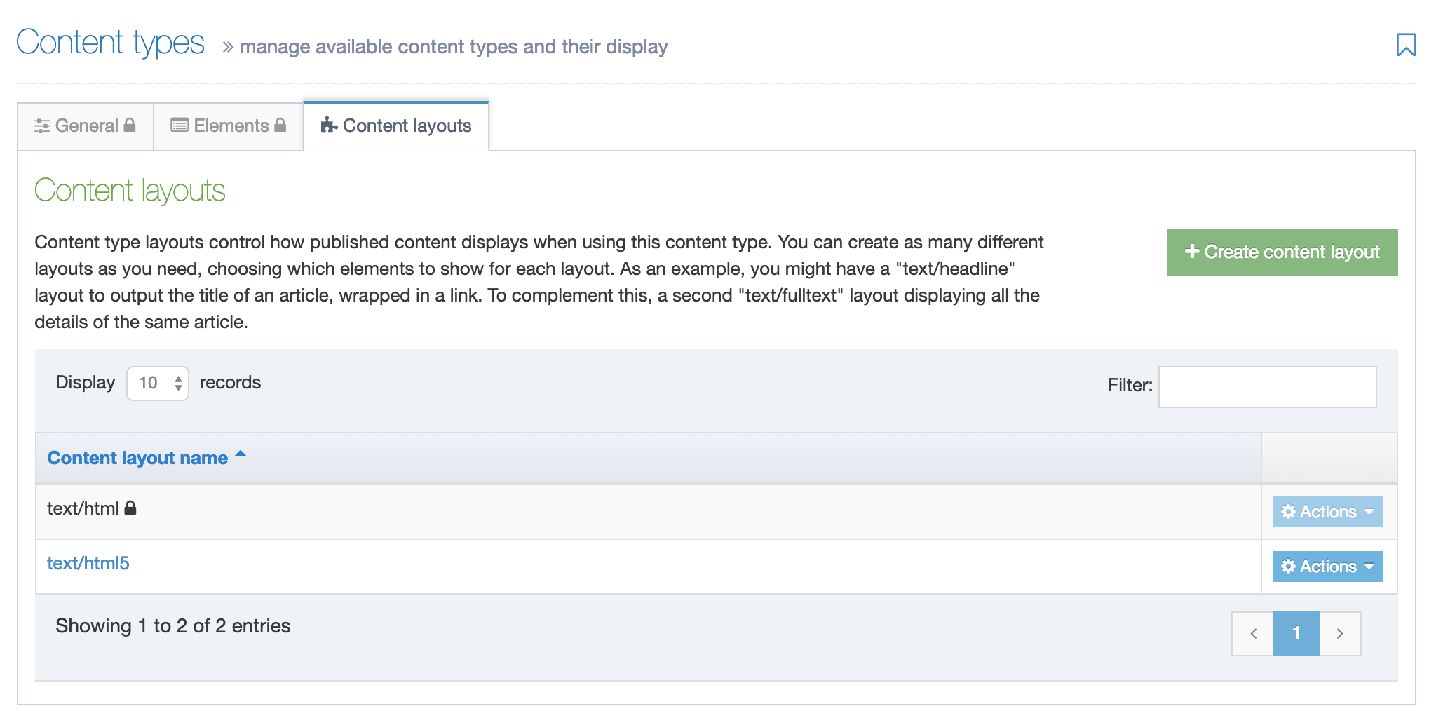 To access Content Layouts, go to the Content Type listing page at Assets > Content Types and identify the Content Type you need. Select the Content Type name or select the Actions button and select Edit. From the Content Type page select the Content Layout tab. You'll see a list of all existing Content Layouts. You can filter the list by name. The number of results listed can be modified via the drop-down list on the top left. If there are no existing Content Layouts, the list will be empty: