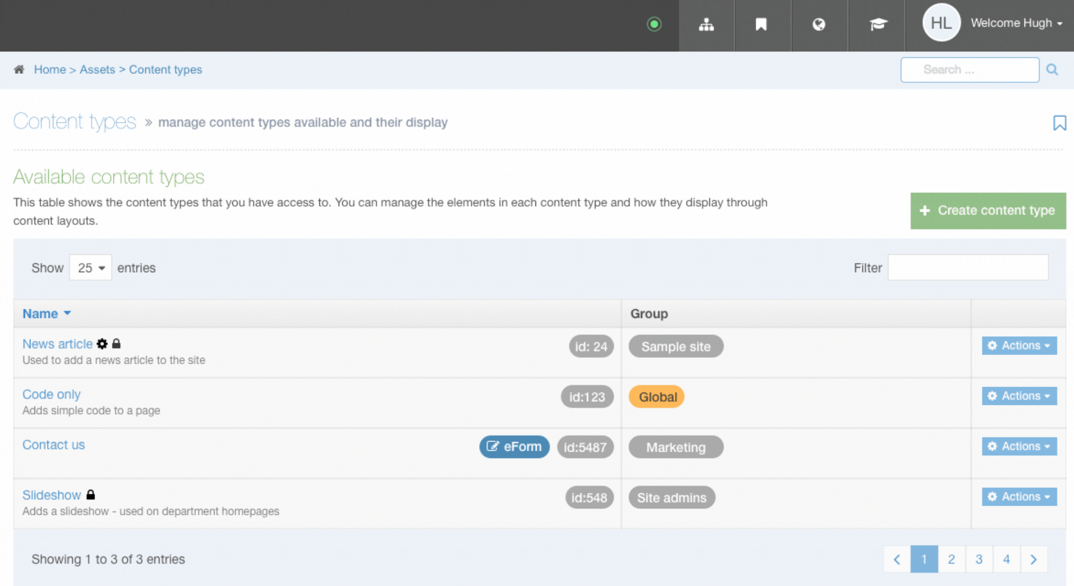 For example, a news article Content Type might comprise Title, Main Body and Image Content elements. A user will populate some or all of these elements when adding a news article to the site.