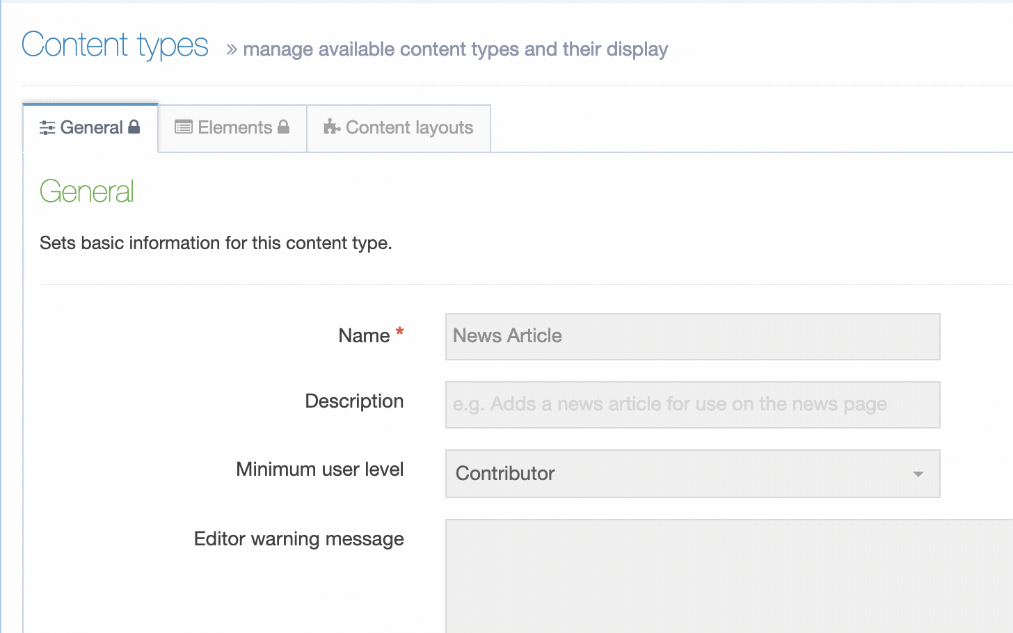 When a locked Content Type is selected, the fields in the General and Element tabs are grayed out: