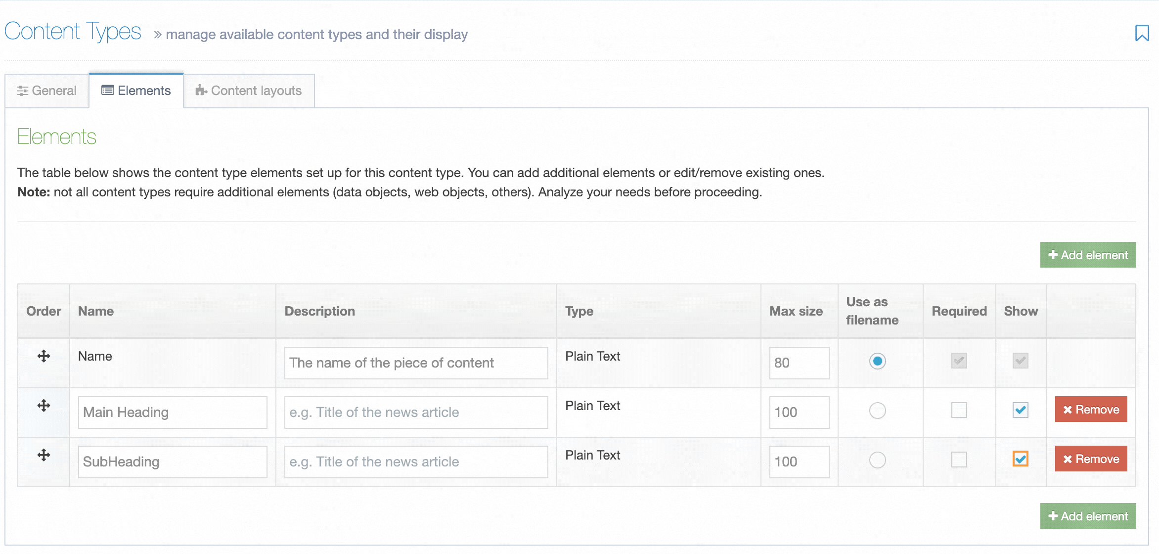 The first element of every Content Type is a plain text element called Name. This element cannot be removed or renamed and the Element Type cannot be changed. Though the Name given is not a unique identifier (since more than one Content Item can share the same name), it is used to allow users to identify content within a Section or when approving content.