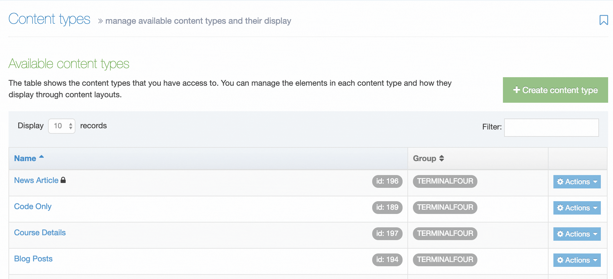 System Content Types are Global Content types that are used by TERMINALFOUR, to store special types of content that are used in various parts of the system. When viewing the Content Type Listing, System Content Types are represented with a System badge. System Content Types cannot be edited, but it is possible to create/edit Content Layouts on them.