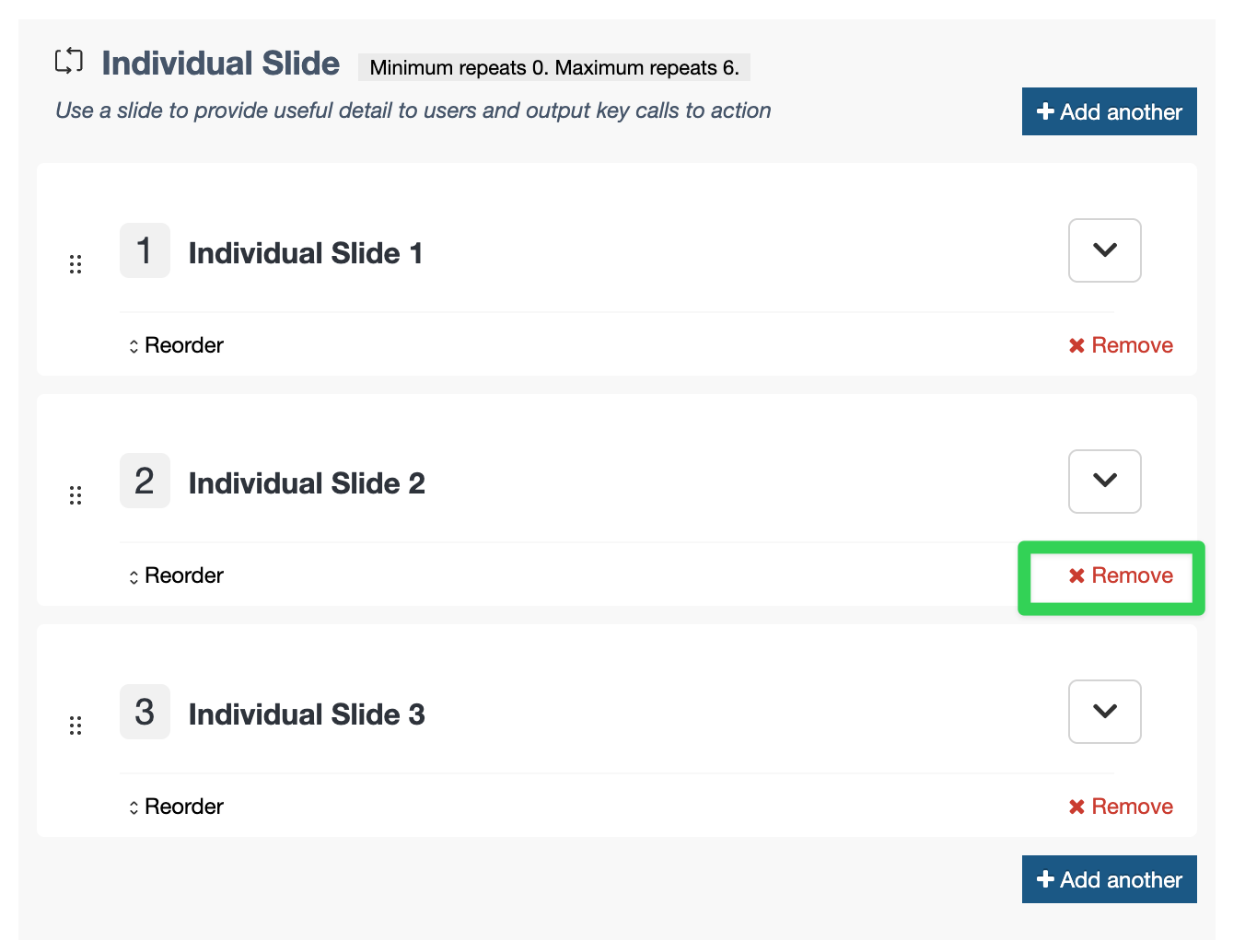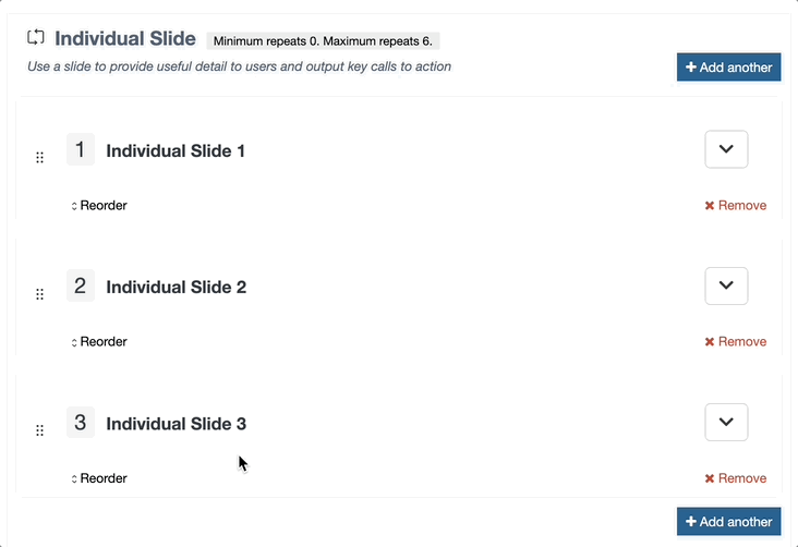 The user has the ability to "Add another" and they can remove and reorder repeated items as needed. The user can collapse the repeated items into an accordion if they don't need to see all elements.