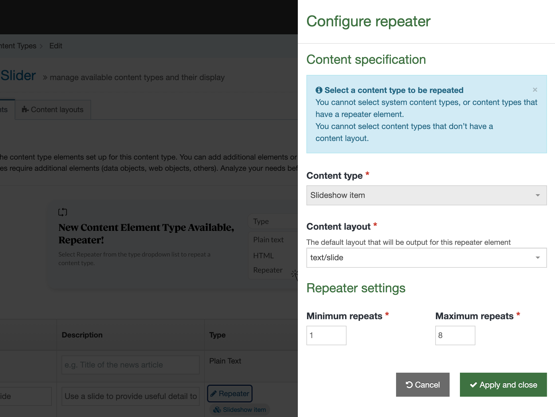 Be sure to click "Apply and Close" to save your settings. You can edit these settings in the future by clicking the "Repeater" link in the element listing table (Note: The default Content Type being repeated cannot be changed after a Repeater element is saved).
