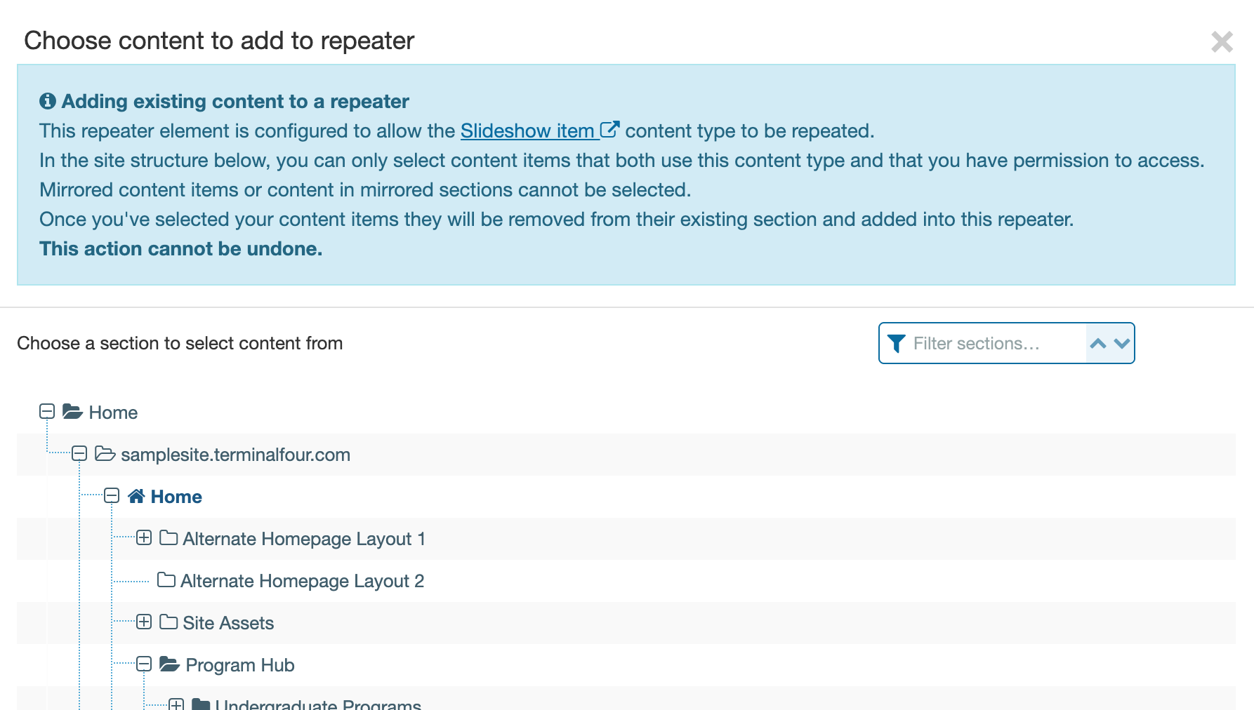 The content will be moved from its current section into the repeater. This action cannot be undone.