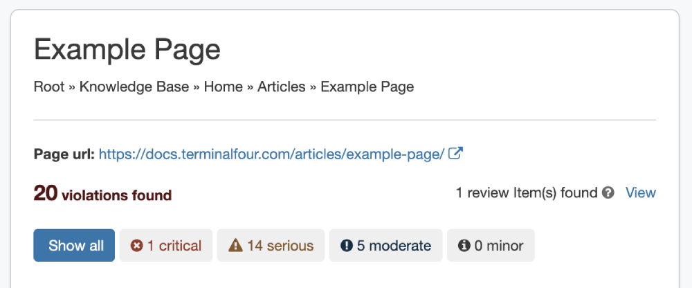 This tool allows users to test any page in the Terminalfour Platform that they have access to to ensure that it means WCAG 2.2 AA standards.