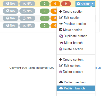 To publish a Branch, expand the Site Structure to display the relevant Branch, and use the Actions menu associated with the section to select Publish Branch from the menu (see below).