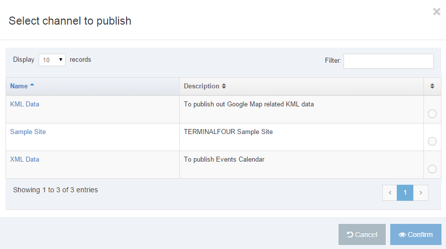 Either click the Channel name or select the Channel's radio button in the right column and click Confirm.