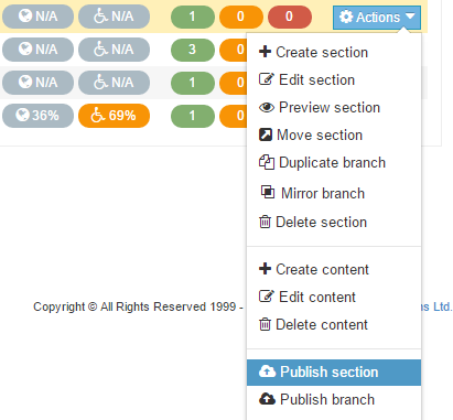 To publish a Section, expand the Site Structure to display the relevant Section, and use the Actions menu associated with the section to select Publish Section from the menu (see below).